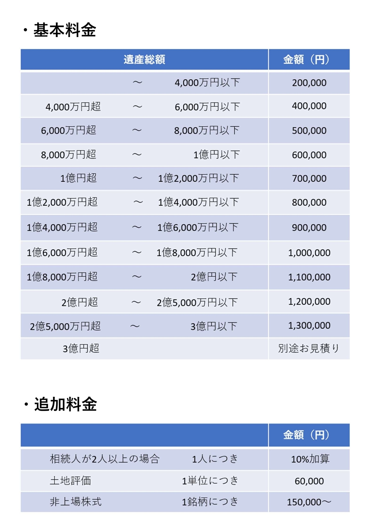⑷ 複雑な事案(相続人間での紛争、延納・物納・納税猶予をご検討されている等)の場合、ご契約から申告期限までの期間が4カ月以内の場合、土地の正面路線に地積を乗じた金額が1単位につき1億円を超える場合、遺産総額が3億円超の場合につきましては別途、御見積いたします。